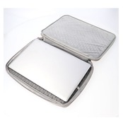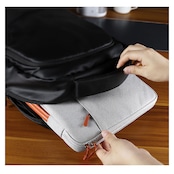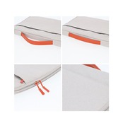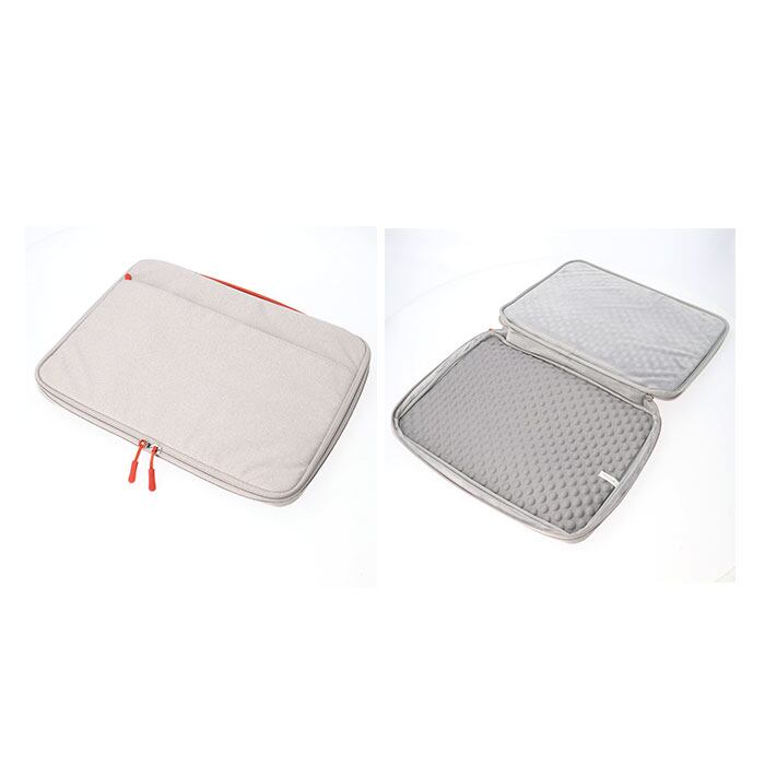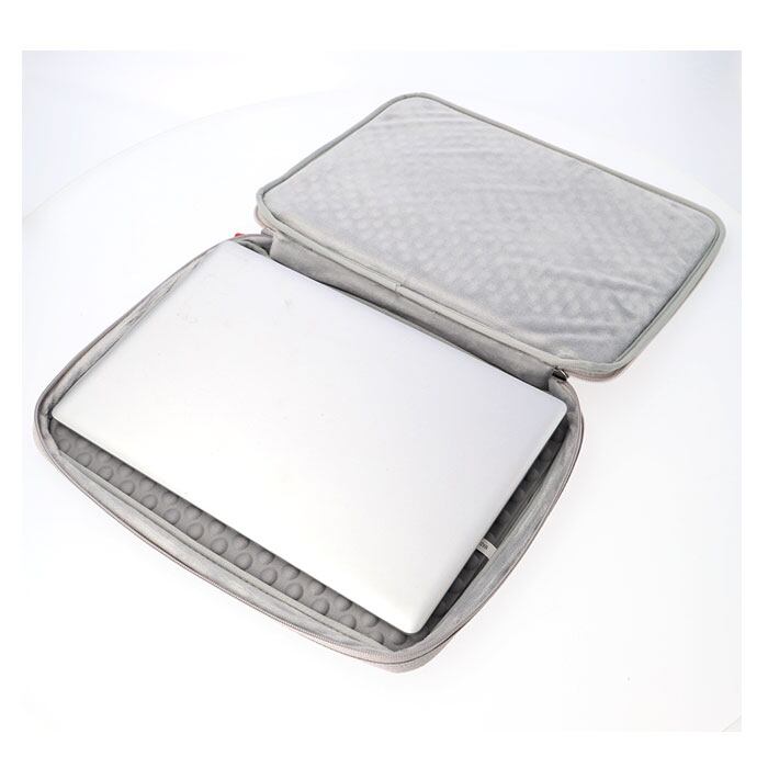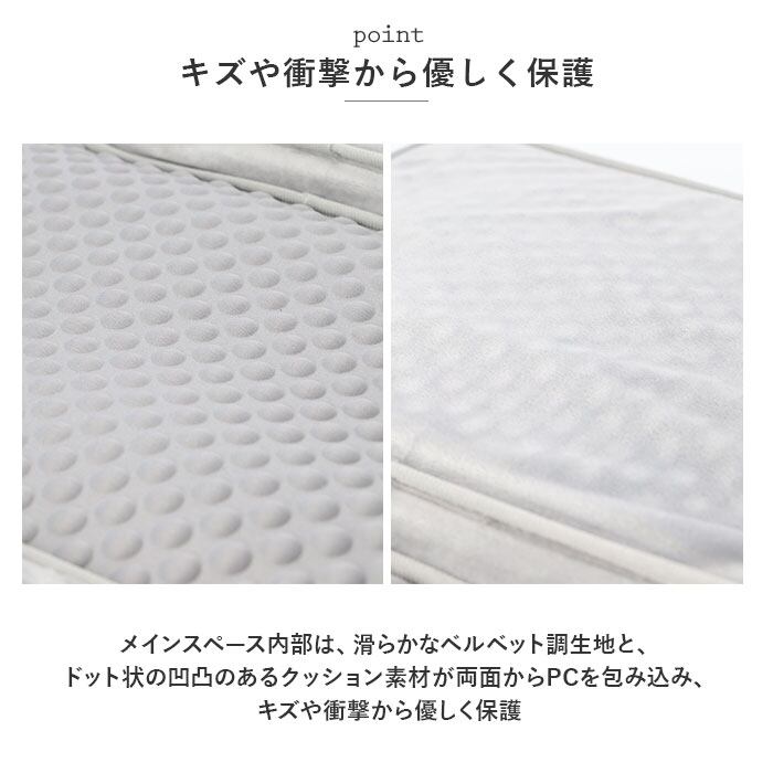 ・メインスペース内部は、滑らかなベルベット調生地と、ドット状の凹凸のあるクッション素材が両面からPCを包み込み、キズや衝撃から優しく保護。