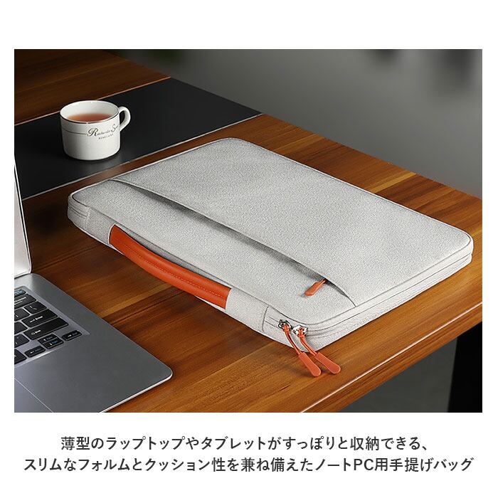 ・薄型のラップトップやタブレットがすっぽりと収納できる、スリムなフォルムとクッション性を兼ね備えたノートPC用手提げバッグ。