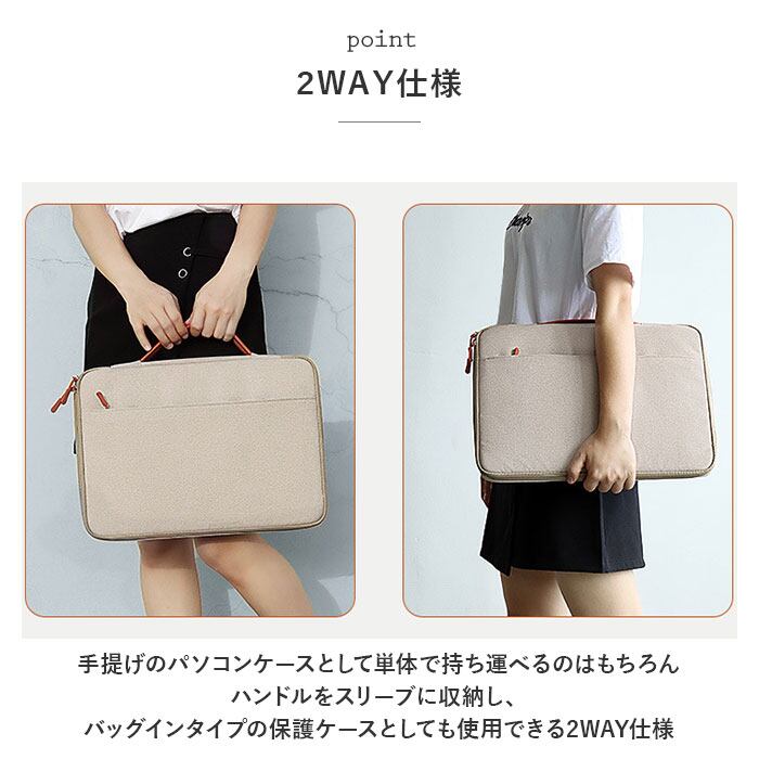 ・手提げのパソコンケースとして単体で持ち運べるのはもちろん、ハンドルをスリーブに収納し、バッグインタイプの保護ケースとしても使用できる2WAY仕様。
