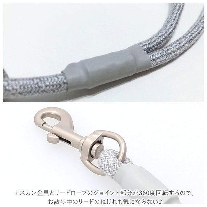 ・ナスカン金具とリードロープのジョイント部分が360度回転するので、お散歩中のリードのねじれも気にならない♪