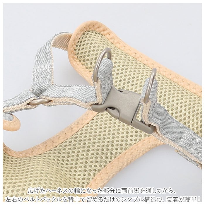 ・広げたハーネスの輪になった部分に両前脚を通してから、左右のベルトバックルを背中で留めるだけのシンプル構造で、装着が簡単!