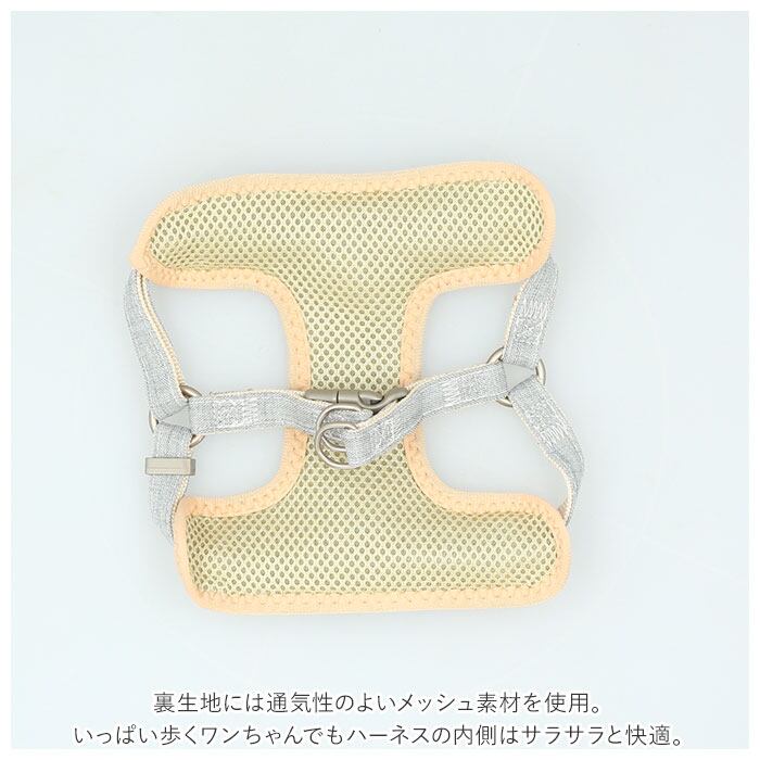 ・ハーネスの表生地はナチュラルなコットン素材、裏生地には通気性のよいメッシュ素材を使用。汗ばむ季節や、いっぱい歩くワンちゃんでもハーネスの内側はサラサラと快適。
