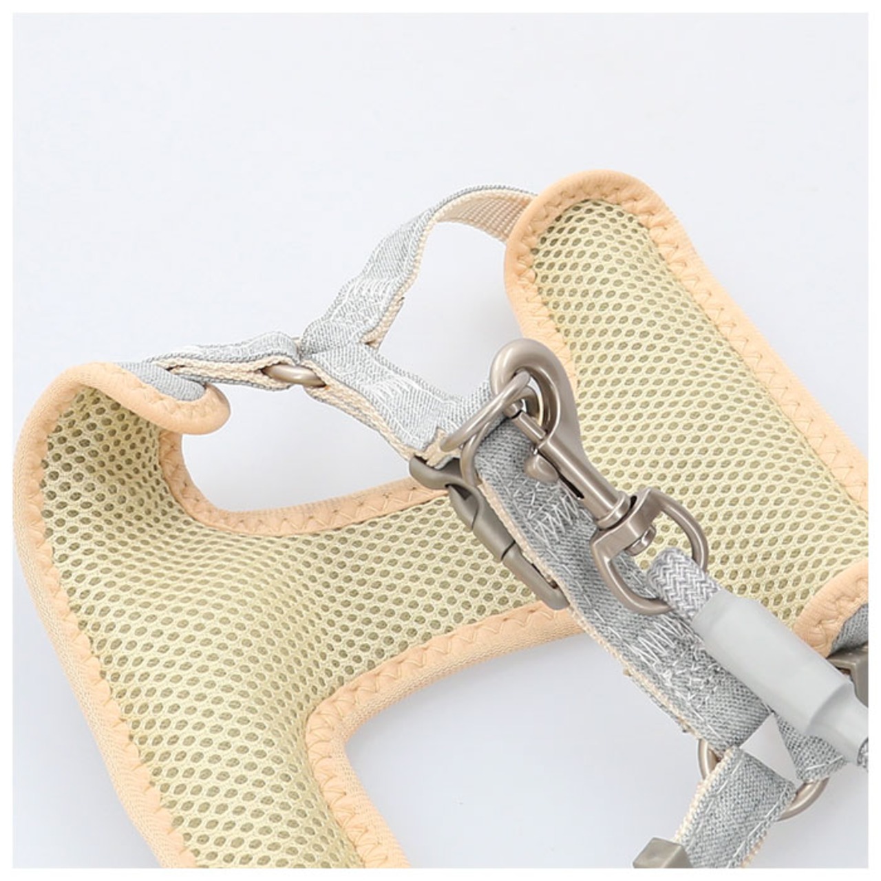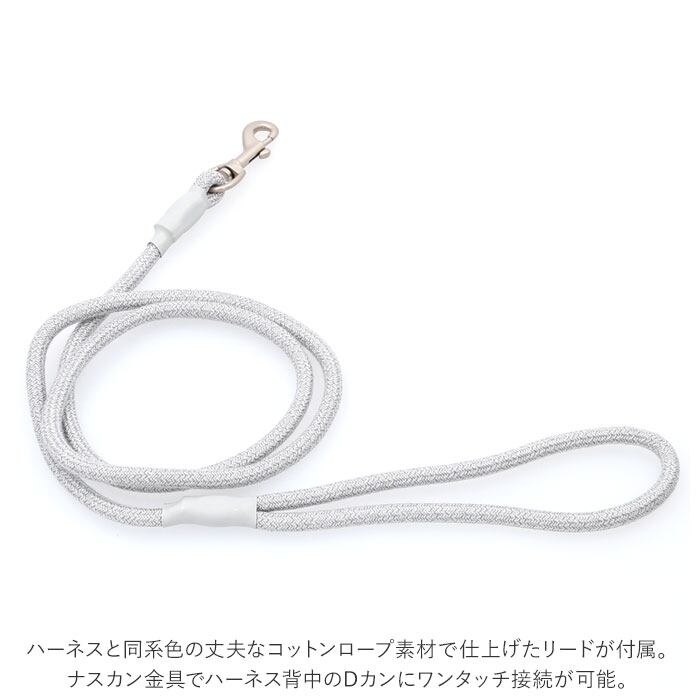 ・ハーネスと同系色の丈夫なコットンロープ素材で仕上げたリードが付属。ナスカン金具でハーネス背中のDカンにワンタッチ接続が可能。