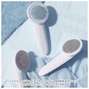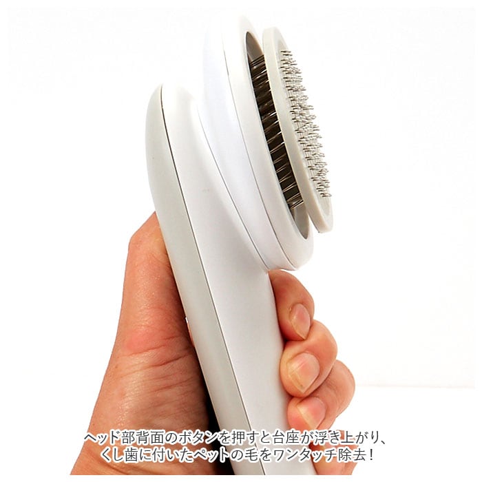 ・ヘッド部背面のボタンを押すと台座が浮き上がり、くし歯に付いたペットの毛をワンタッチ除去!あとは毛玉をポンッとくずかごに捨てるだけ!