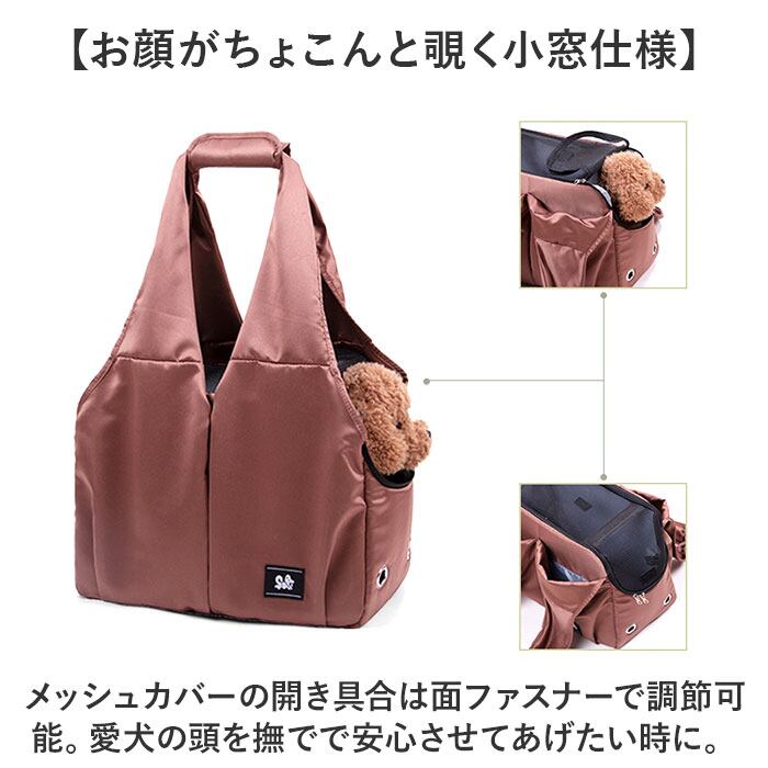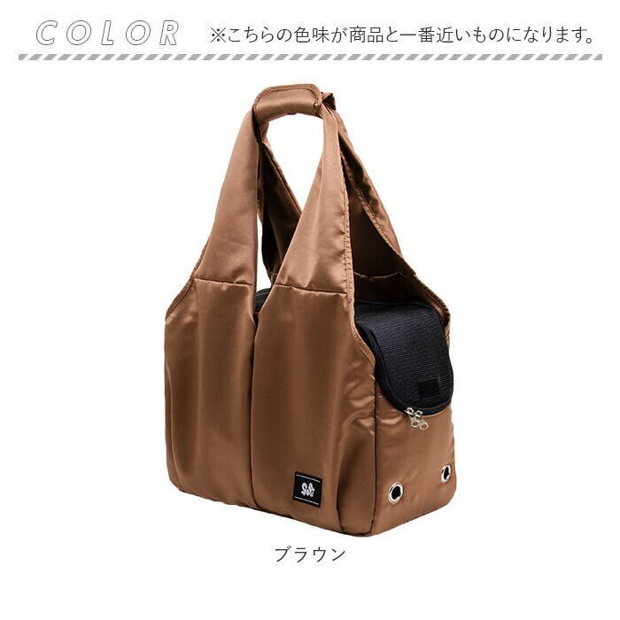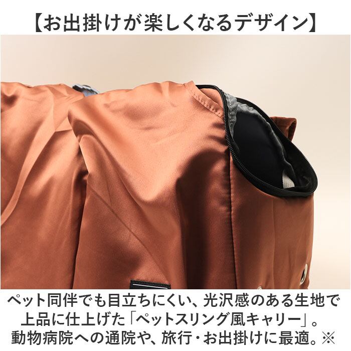 ・ペット同伴でも目立ちにくい、光沢感のある生地で上品に仕上げた「ペットスリング風キャリー」。動物病院への通院や、ペットと一緒の旅行・お出掛けに最適。