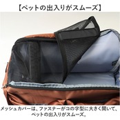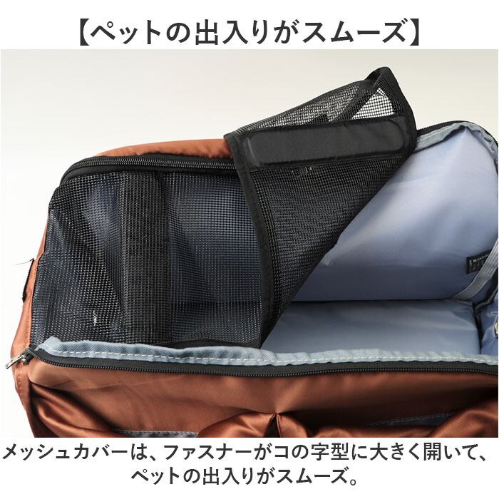 ・メッシュカバーは、ファスナーがコの字型に大きく開いて、ペットの出入りがスムーズ。