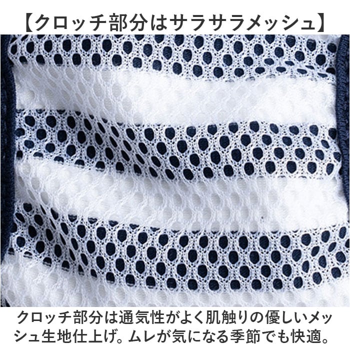 ・クロッチ部分は通気性がよく肌触りの優しいメッシュ生地仕上げ。ムレが気になる季節でも快適。