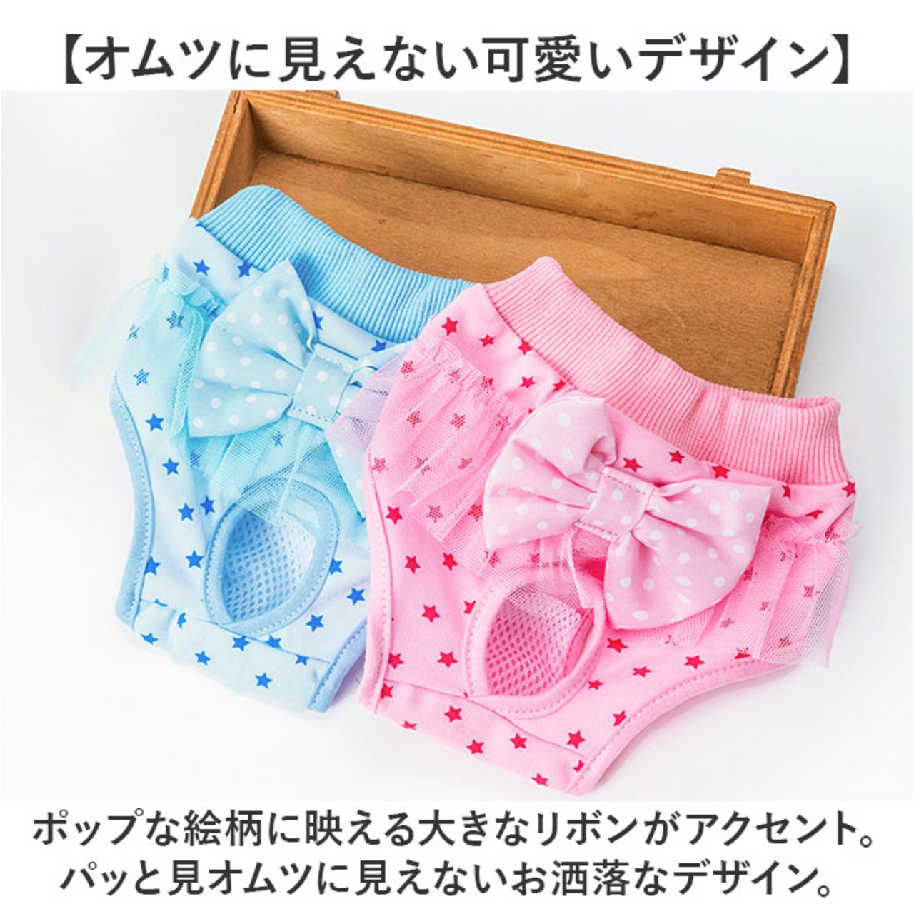 ・ポップな絵柄に映える大きなリボンがアクセント。パッと見オムツに見えないお洒落なデザイン。
