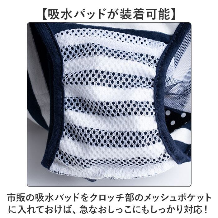 ・市販の吸水パッドをクロッチ部のメッシュポケットに入れておけば、急なおしっこにもしっかり対応!