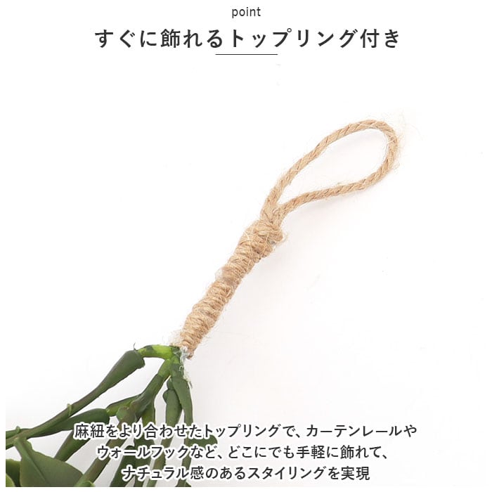 ・麻紐をより合わせたトップリングで、カーテンレールやウォールフックなど、どこにでも手軽に飾れて、ナチュラル感のあるスタイリングを実現