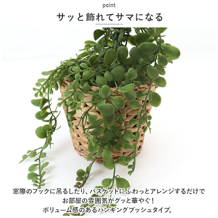 ・窓際のフックに吊るしたり、バスケットにふわっとアレンジするだけでお部屋の雰囲気がグッと華やぐ!ボリューム感のあるハンギングブッシュタイプ。