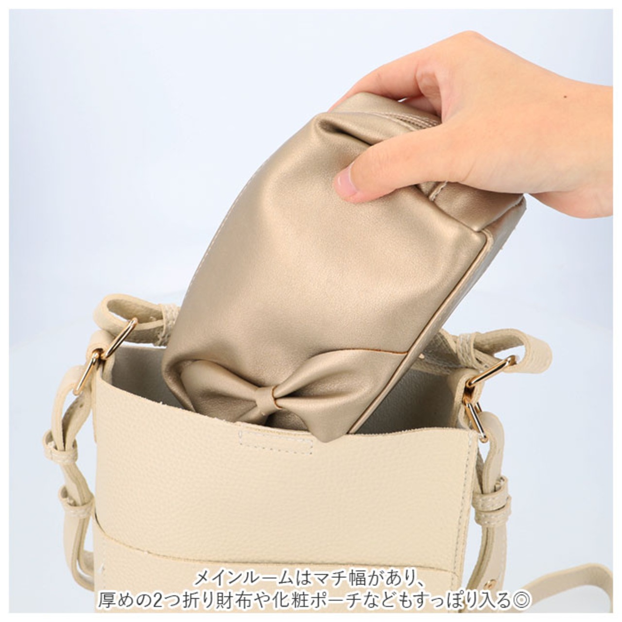 ・メインルームはマチ幅があり、厚めの2つ折り財布や化粧ポーチなどもすっぽり入る◎