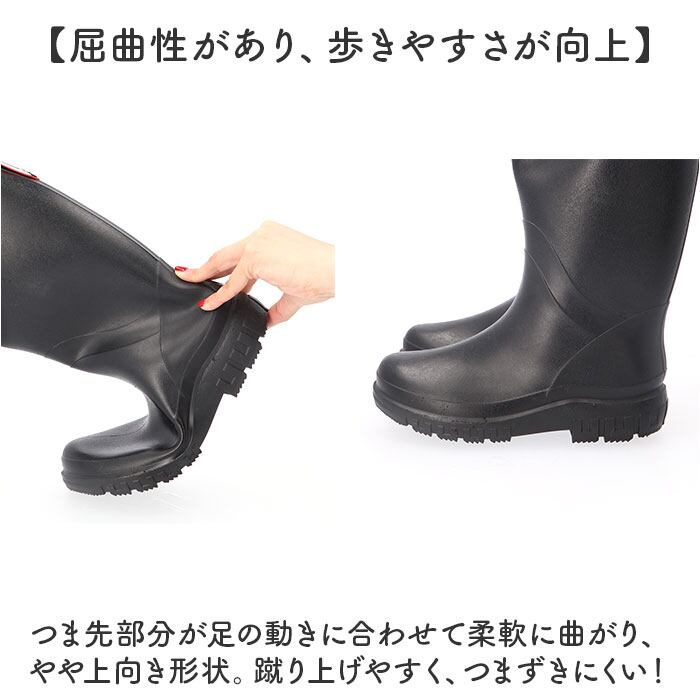 ・膝下あたりまですっぽり覆えるロングブーツ。雨の強い日や、ぬかるんだ路面でも安心。