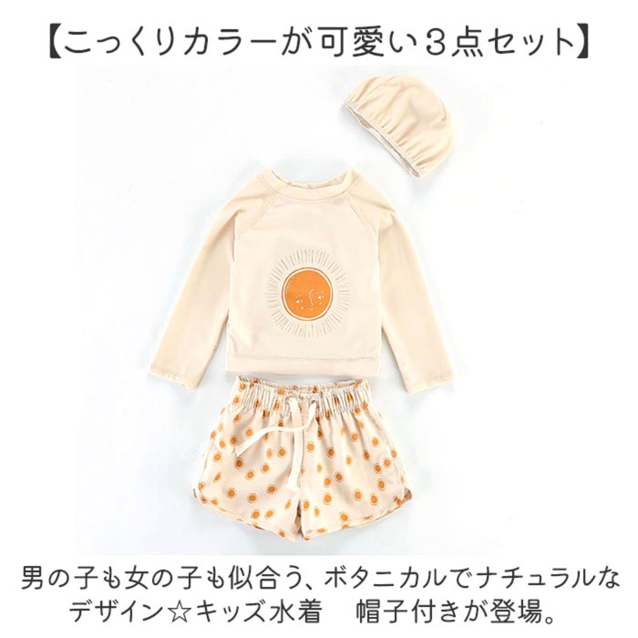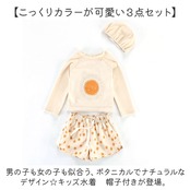 ・男の子も女の子も似合う、ボタニカルでナチュラルなデザイン☆キッズ水着 帽子付きが登場。