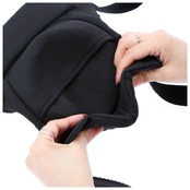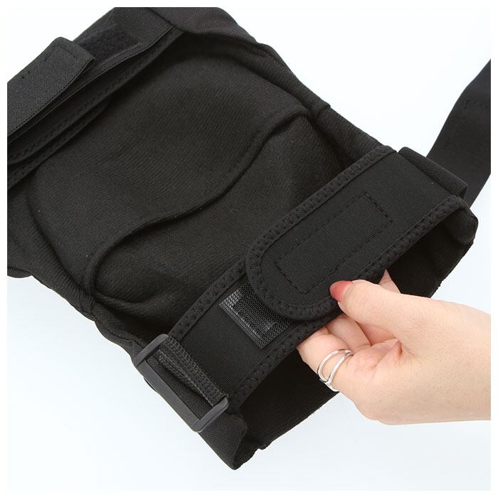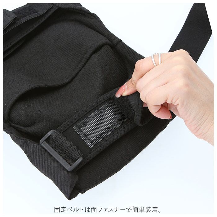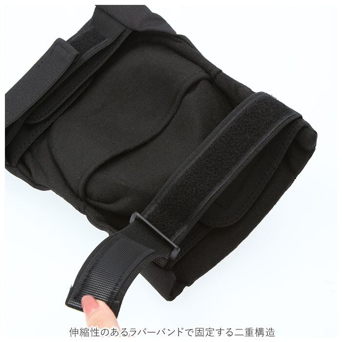 ・固定ベルトは面ファスナーで簡単装着。さらに伸縮性のあるラバーバンドで固定する二重構造。