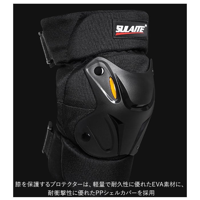 ・膝を保護するプロテクターは、軽量で耐久性に優れたEVA素材に、耐衝撃性に優れたPPシェルカバーを採用。