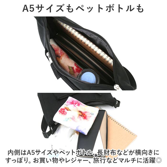 ・内側はA5サイズやペットボトル、長財布などが横向きにすっぽり。お買い物やレジャー、旅行などマルチに活躍◎