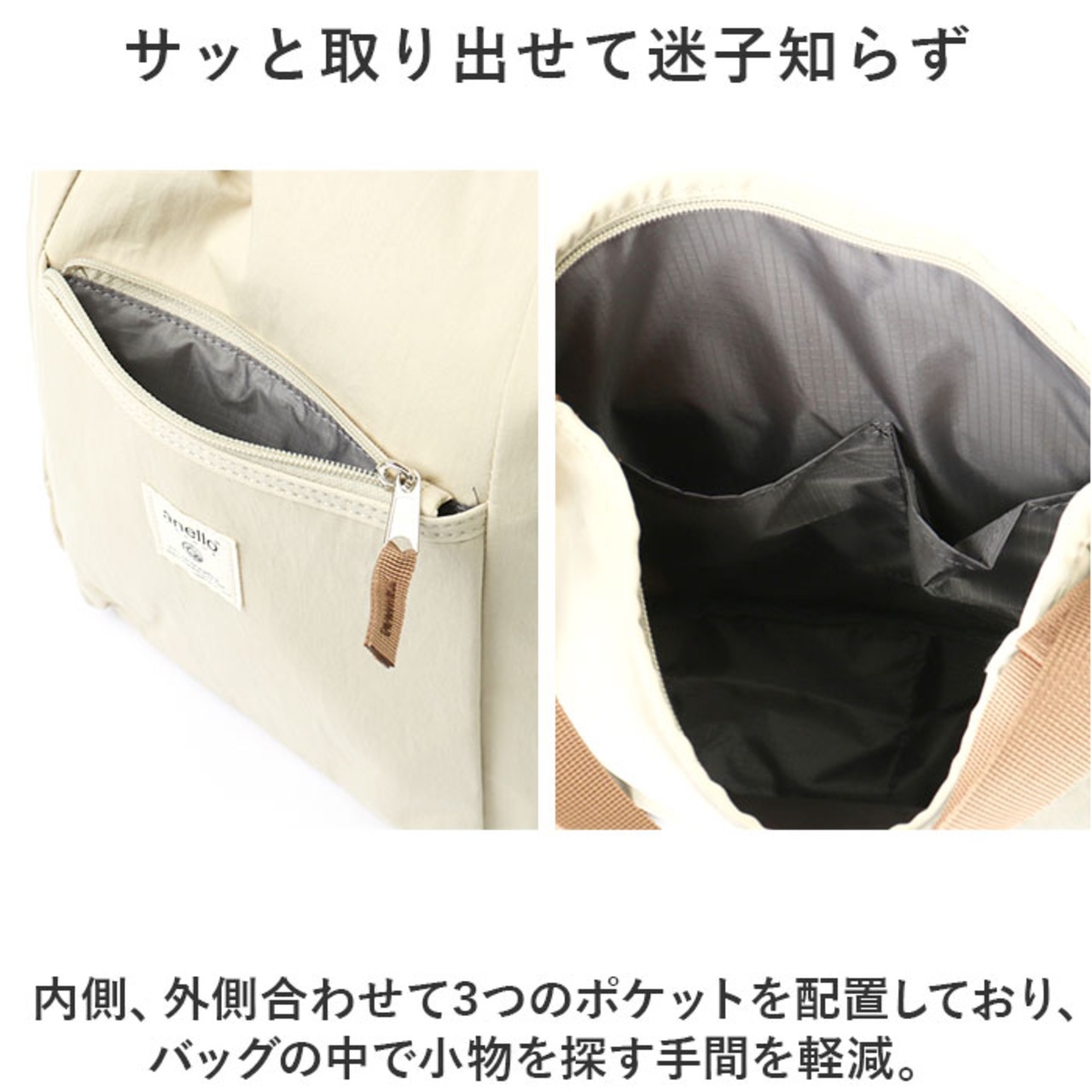 ・内側、外側合わせて3つのポケットを配置しており、バッグの中で小物を探す手間を軽減。