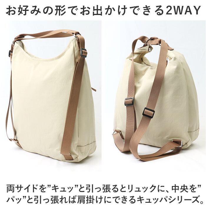 ・両サイドを”キュッ”と引っ張るとリュックに、中央を”パッ”と引っ張れば肩掛けにできるキュッパシリーズ。