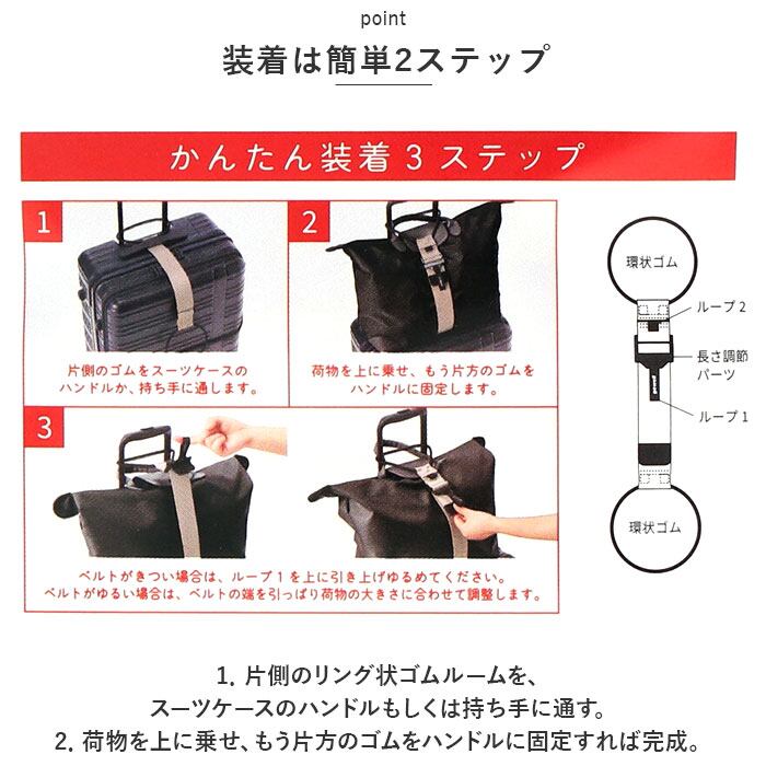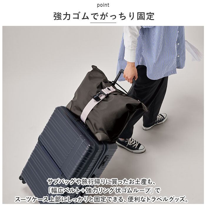 ・サブバッグや旅行帰りに買ったお土産も、「幅広ベルト+強力リング状ゴムループ」でスーツケース上部にしっかりと固定できる、便利なトラベルグッズ。