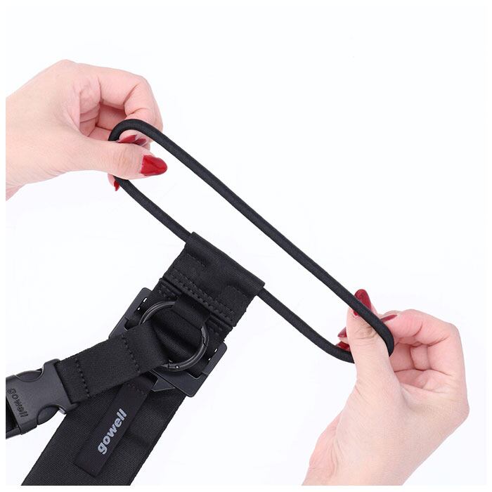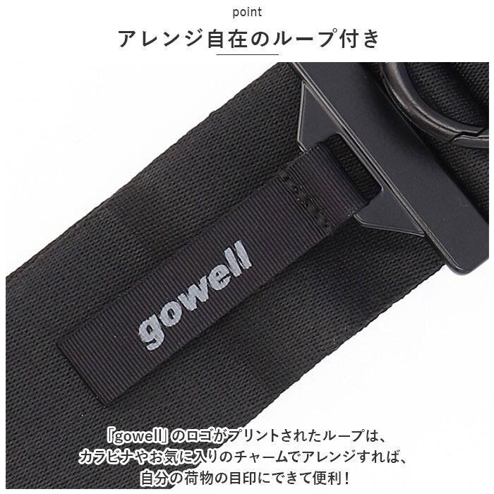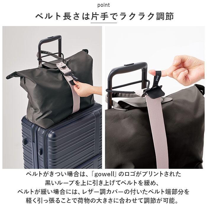 ・ベルトがきつい場合は、「gowell」のロゴがプリントされた黒いループを上に引き上げてベルトを緩め、ベルトが緩い場合には、レザー調カバーの付いたベルト端部分を軽く引っ張ることで荷物の大きさに合わせて調節が可能。