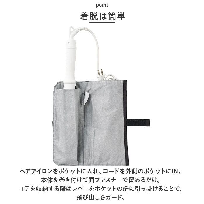 ・ヘアアイロンをポケットに入れ、コードを外側のポケットにIN。本体を巻き付けて面ファスナーで留めるだけ。コテを収納する際はレバーをポケットの端に引っ掛けることで、飛び出しをガード。