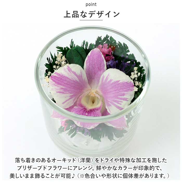 ・落ち着きのあるオーキッド(洋蘭)をドライや特殊な加工を施したプリザーブドフラワーにアレンジ。鮮やかなカラーが印象的で、美しいまま飾ることが可能♪(※色合いや形状に個体差があります。)