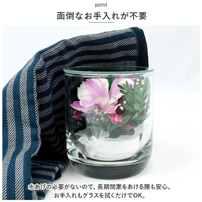 ・水あげの必要がないので、長期間家をあける際も安心。お手入れもグラスを拭くだけでOK。