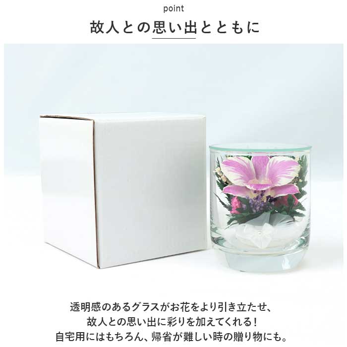 ・透明感のあるグラスがお花をより引き立たせ、故人との思い出に彩りを加えてくれる!自宅用にはもちろん、帰省が難しい時の贈り物にも。