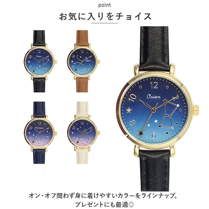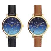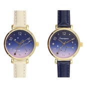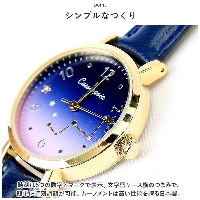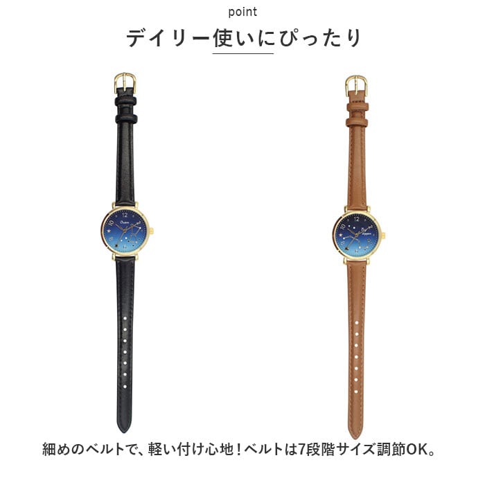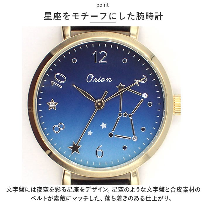 ・文字盤には夜空を彩る星座をデザイン。星空のような文字盤と合皮素材のベルトが素敵にマッチした、落ち着きのある仕上がり。