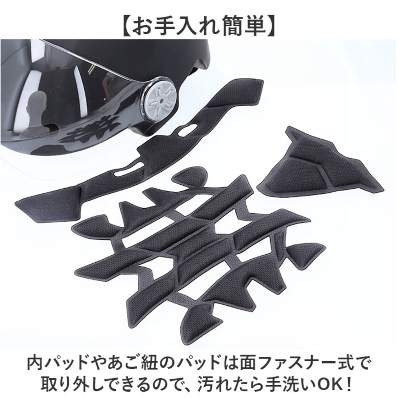 ・内パッドやあご紐のパッドは面ファスナー式で取り外しできるので、汚れたら手洗いOK!