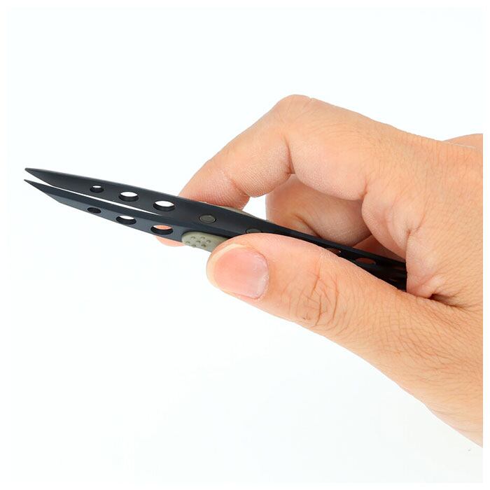 ・粘着物を掴むのに便利な、フッ素コーティング加工を施したピンセット3型(P-3F)。