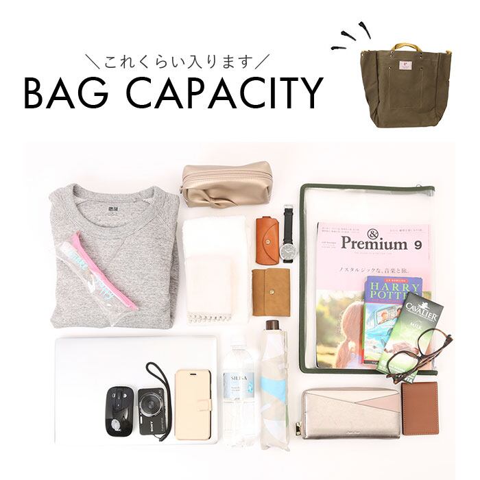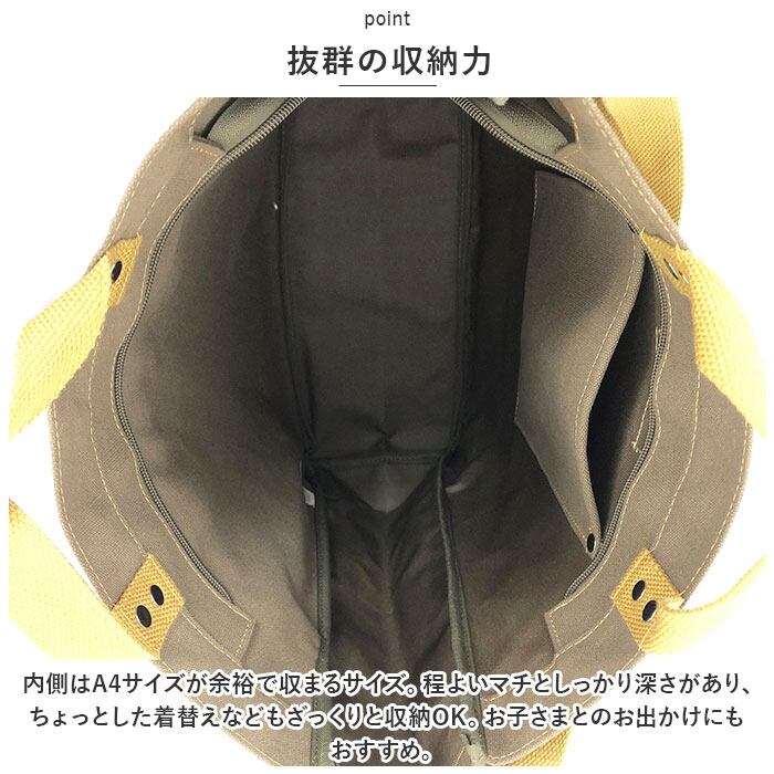 ・内側はA4サイズが余裕で収まるサイズ。程よいマチとしっかり深さがあり、ちょっとした着替えなどもざっくりと収納OK。お子さまとのお出かけにもおすすめ。