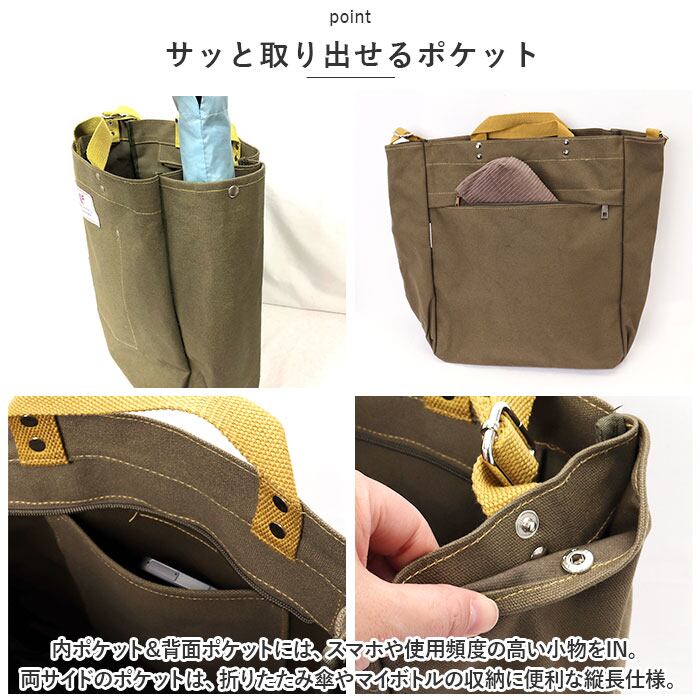 ・内ポケット&背面ポケットには、スマホや使用頻度の高い小物をIN。両サイドのポケットは、折りたたみ傘やマイボトルの収納に便利な縦長仕様。