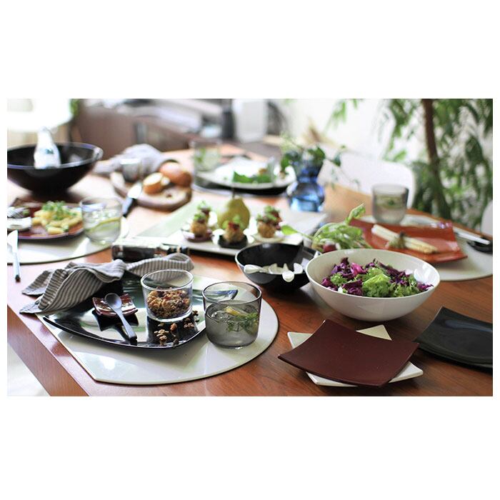 ・和洋ジャンル問わず使える白黒リバーシブルタイプ。表面は白色でつるっとしたツヤのある質感。裏面は黒色でスリ傷がつきにくいツヤ消し加工を施し、少し凹凸のある仕上がりに。