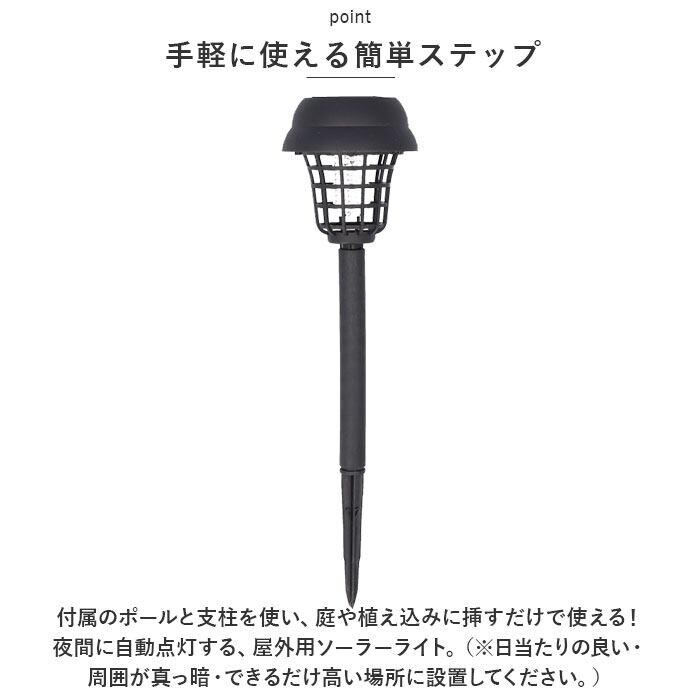 ・付属のポールと支柱を使い、庭や植え込みに挿すだけで使える!夜間に自動点灯する、屋外用ソーラーライト。(※日当たりの良い・周囲が真っ暗・できるだけ高い場所に設置してください。)
