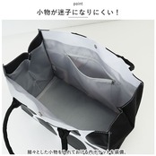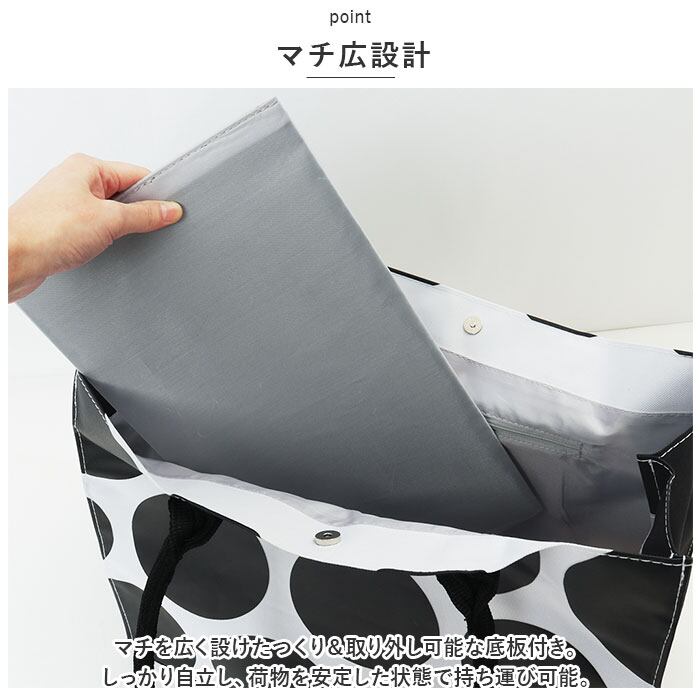 ・マチを広く設けたつくり&取り外し可能な底板付き。しっかり自立し、荷物を安定した状態で持ち運び可能。