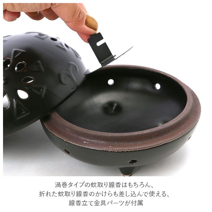 ・渦巻タイプの蚊取り線香はもちろん、折れた蚊取り線香のかけらも差し込んで使える、線香立て金具パーツが付属。