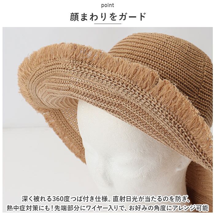 ・深く被れる360度つば付き仕様。直射日光が当たるのを防ぎ、熱中症対策にも!先端部分にワイヤー入りで、お好みの角度にアレンジ可能。