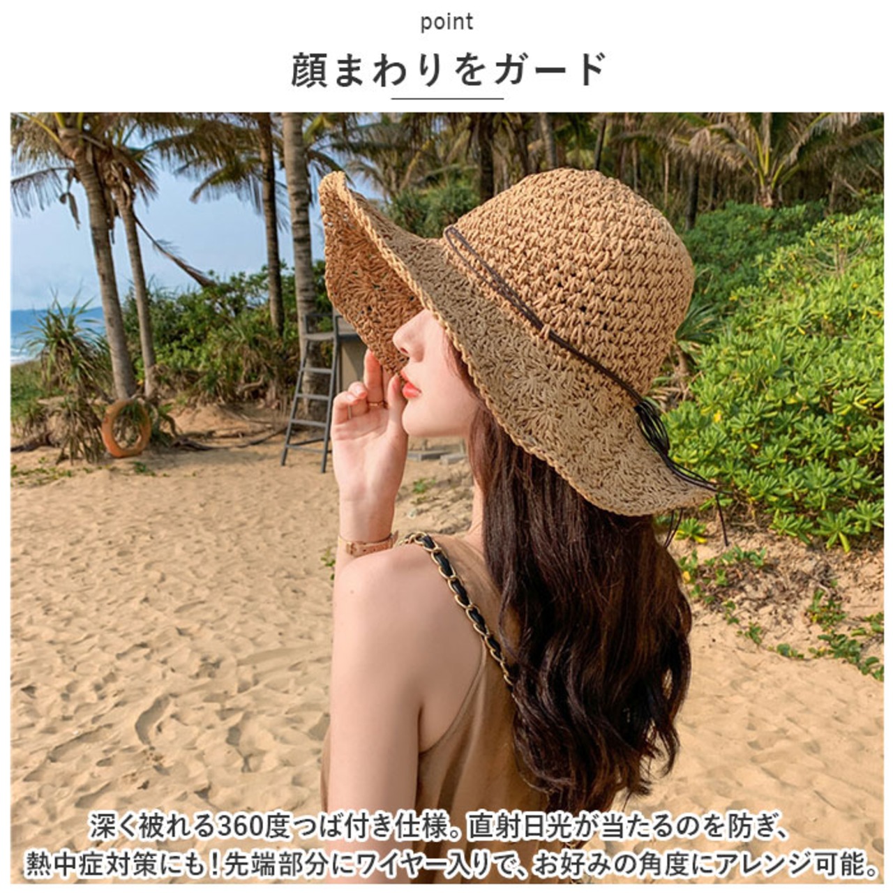 ・深く被れる360度つば付き仕様。直射日光が当たるのを防ぎ、熱中症対策にも!先端部分にワイヤー入りで、お好みの角度にアレンジ可能。