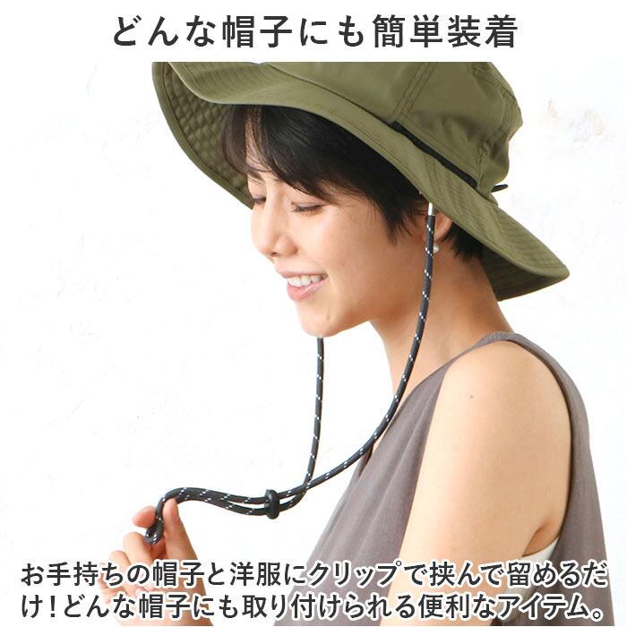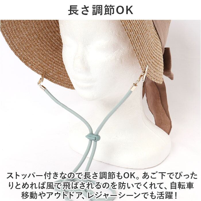 ・ストッパー付きなので長さ調節もOK。あご下でぴったりとめれば風で飛ばされるのを防いでくれて、自転車移動やアウトドア、レジャーシーンでも活躍!