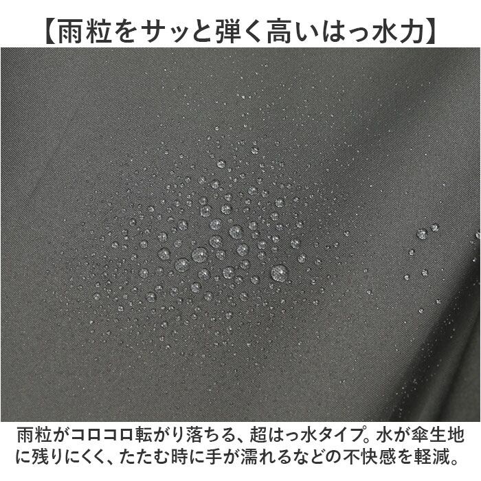 ・雨粒がコロコロ転がり落ちる、超はっ水タイプ。水が傘生地に残りにくく、たたむ時に手が濡れるなどの不快感を軽減。