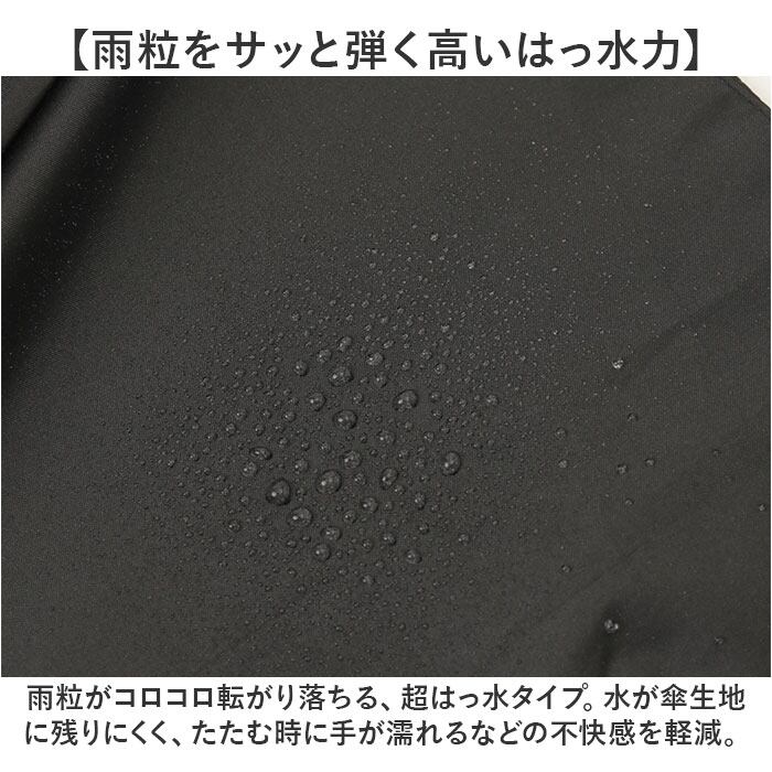 ・雨粒がコロコロ転がり落ちる、超はっ水タイプ。水が傘生地に残りにくく、たたむ時に手が濡れるなどの不快感を軽減。