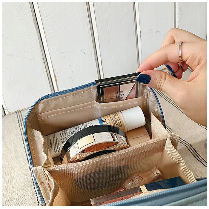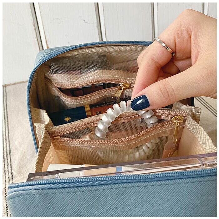 ・ポーチを閉じても中身が飛び出しにくいファスナーポケット付き!仕切りのメッシュポケットもあり、細かいメイクグッズを整理整頓できる。