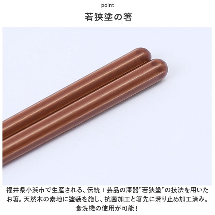 ・福井県小浜市で生産される、伝統工芸品の漆器”若狭塗”の技法を用いたお箸。天然木の素地に塗装を施し、抗菌加工と箸先に滑り止め加工済み。食洗機の使用が可能!