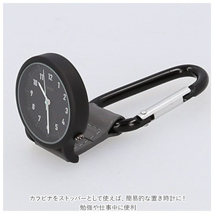 ・カラビナをストッパーとして使えば、簡易的な置き時計に!勉強や仕事中に便利。