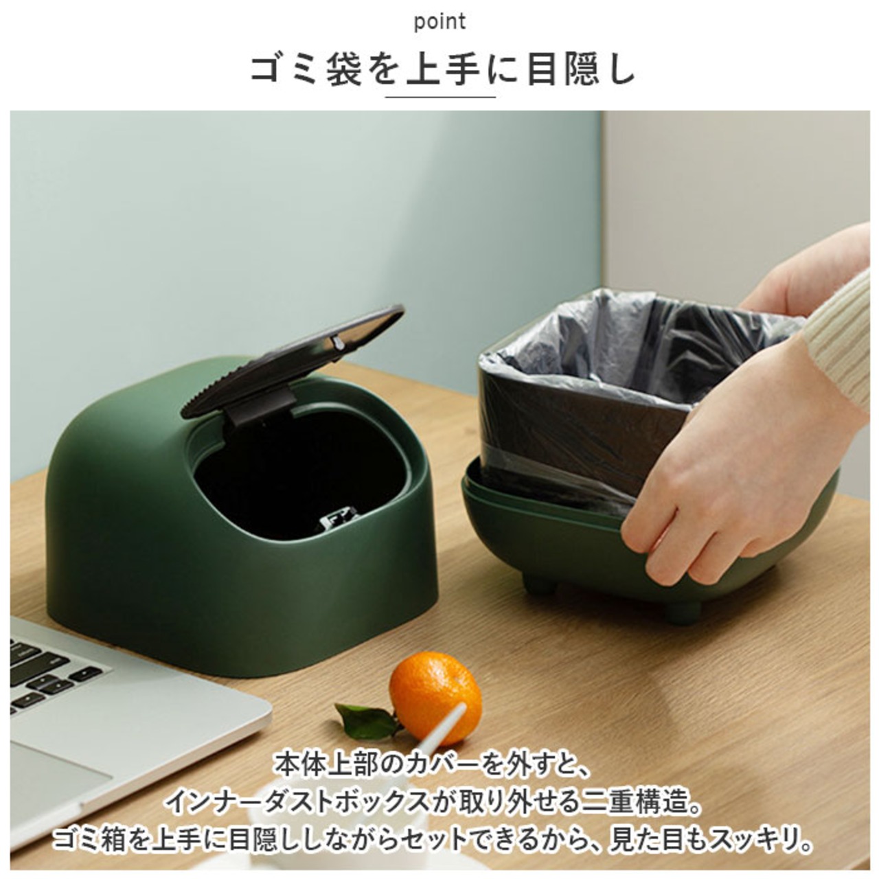 ・本体上部のカバーを外すと、インナーダストボックスが取り外せる二重構造。ゴミ箱を上手に目隠ししながらセットできるから、見た目もスッキリ。