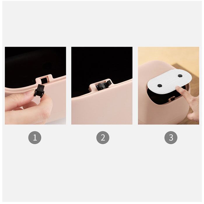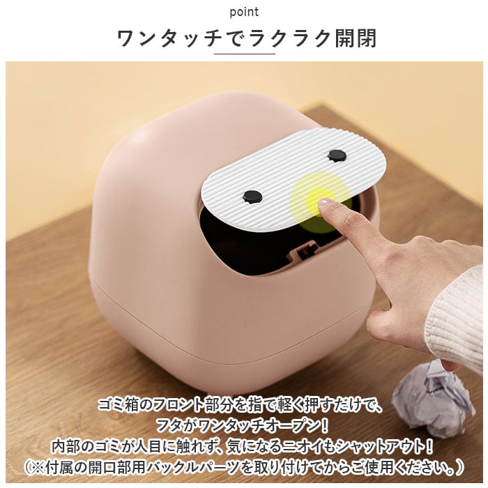 ・ゴミ箱のフロント部分を指で軽く押すだけで、フタがワンタッチオープン!内部のゴミが人目に触れず、気になるニオイもシャットアウト!(※付属の開口部用バックルパーツを取り付けてからご使用ください。)