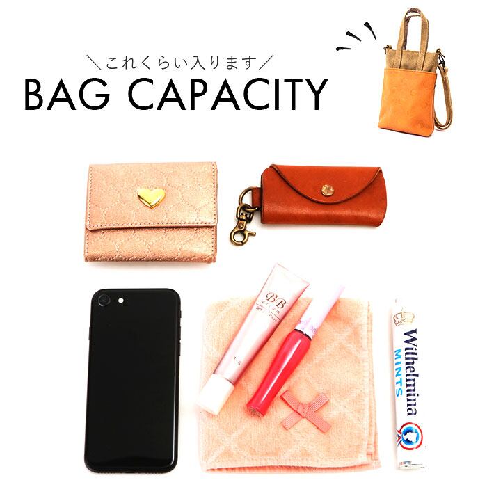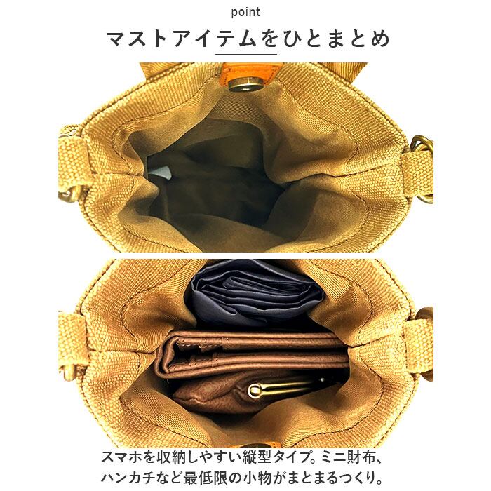 ・スマホを収納しやすい縦型タイプ。ミニ財布、ハンカチなど最低限の小物がまとまるつくり。