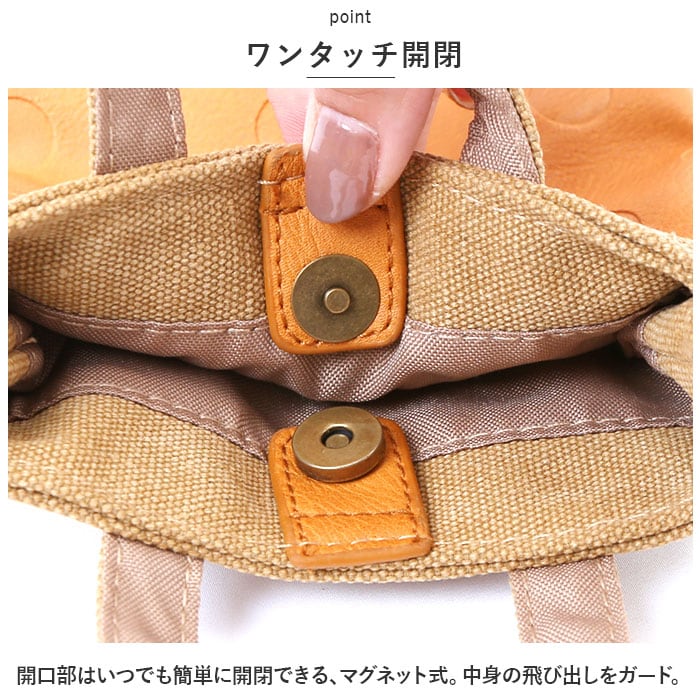 ・型押しドットを施したフェイクレザー素材に、ナチュラルな帆布生地をプラス。異なる質感をドッキングさせつつトーンを揃えることで、ヴィンテージ感と上品さを併せ持った仕上がりに。